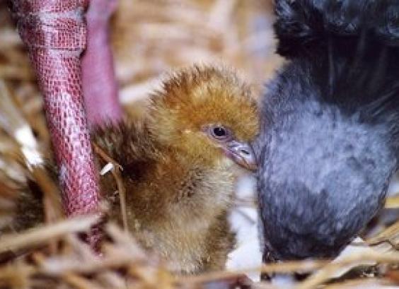 De kuikens zijn donzig geelachtig tot lichtbruin van onder en donkerder bruin van boven. Ze hebben een relatief grote kop en korte snavel. De poten zijn vleeskleurig en stevig, en de iris donker.
