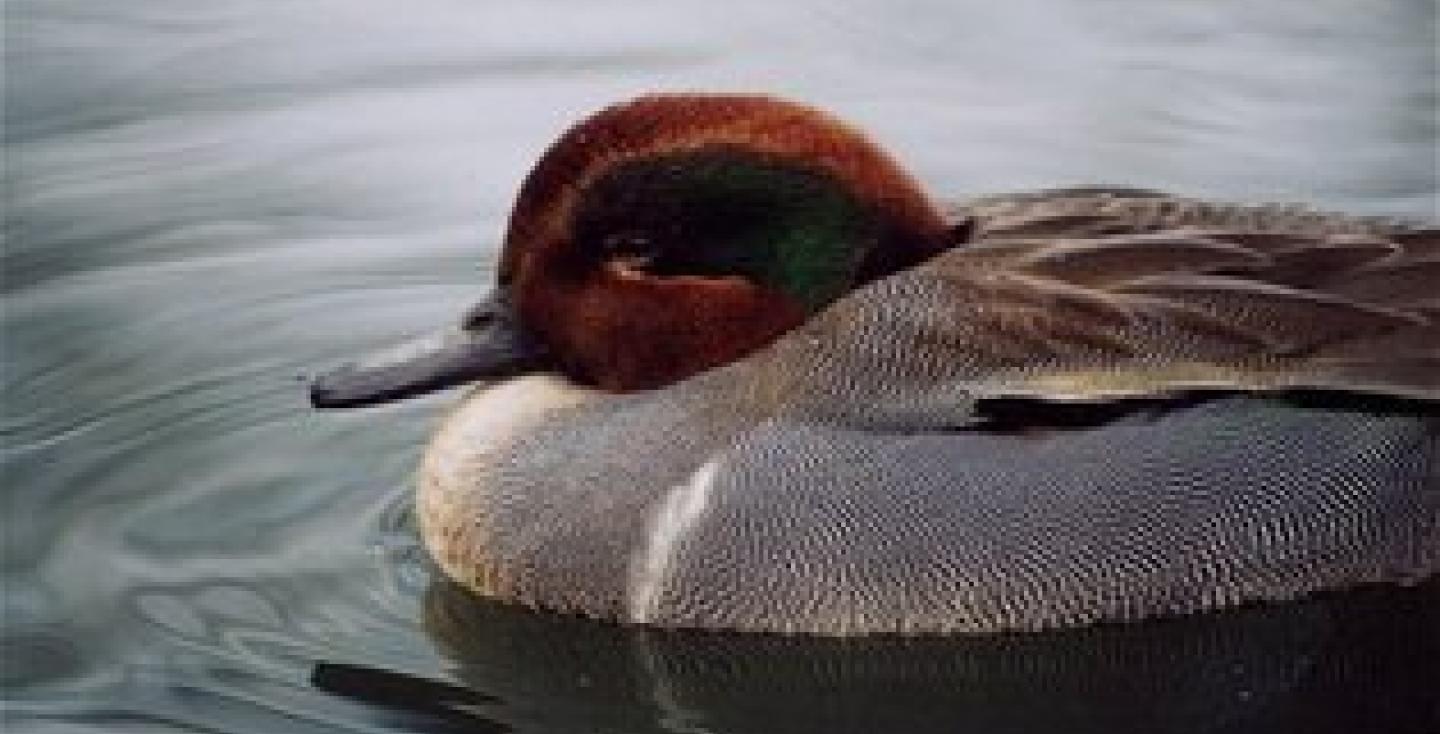 Dit kleine eendje, bekend als de Amerikaanse wintertaling, komt oorspronkelijk voor in Noord-Amerika en trekt ook wel als dwaalgast naar Europa. Het is vooral te vinden in ondiepe wateren van moerassen, plassen en meren, waar het foerageert op zaden, waterplanten en kleine waterdieren. In het voorjaar vormen koppels zich pas laat, waarna het vrouwtje een nest met 6-9 eieren maakt. Deze soort is vrij schuw, maar in de broedtijd soms territoriaal; buiten de voortplanting leeft hij vaak in groepen. Het mannetje valt op door een kastanjebruine kop met groene plek rond het oog, het vrouwtje is meer onopvallend bruin. Kenmerkend zijn de relatief kleine omvang en het snelle, wendbare vlieggedrag.